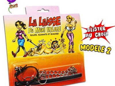 Laisse du mari volage. Chaînette et clochette métalliques, poignée et collier simili cuir, présentée sous blister humoristique décoré. Modèle blister au choix, prix unitaire. Longueur laisse : modèle 1 = 33 cm / modèle 2 = 53 cm.