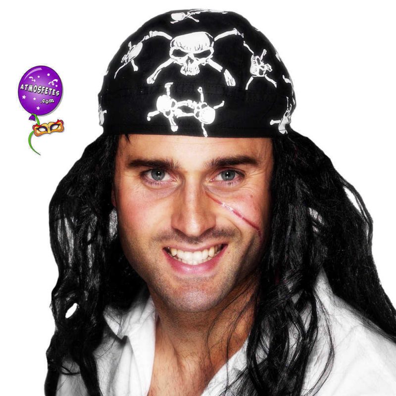 bandana de pirate à têtes de morts foulard bandeau madras carré de tissu noir et blanc corsaire flibustier jack sparrow capitaine crochet bandit squelette accessoire de déguisement