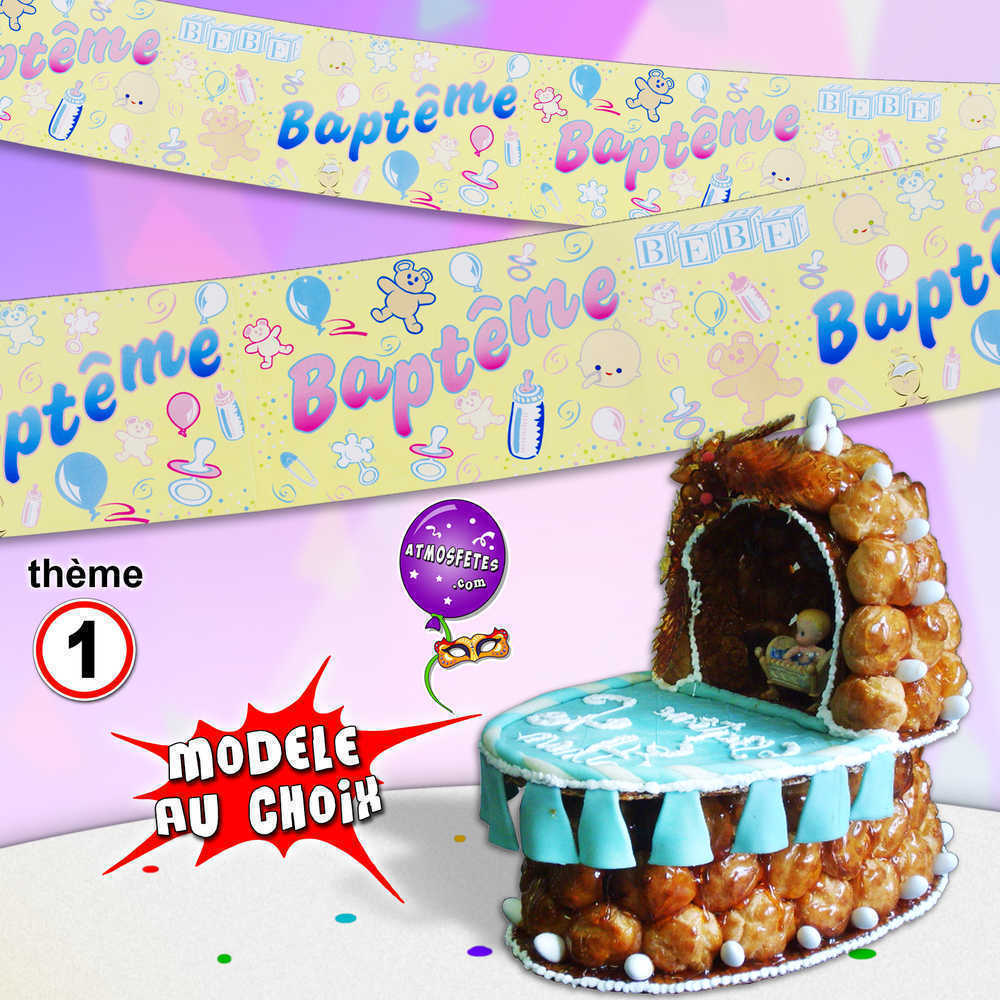 Bannière couleur portant l’inscription « baptême » en bleu et rose, festive et joviale, elle sera du plus bel effet, à fixer à l’aide de punaises, (matière carton glacé, hauteur 16 cm, longueur 2,44 mètres, imprimée sur une seule face, prix unitaire).