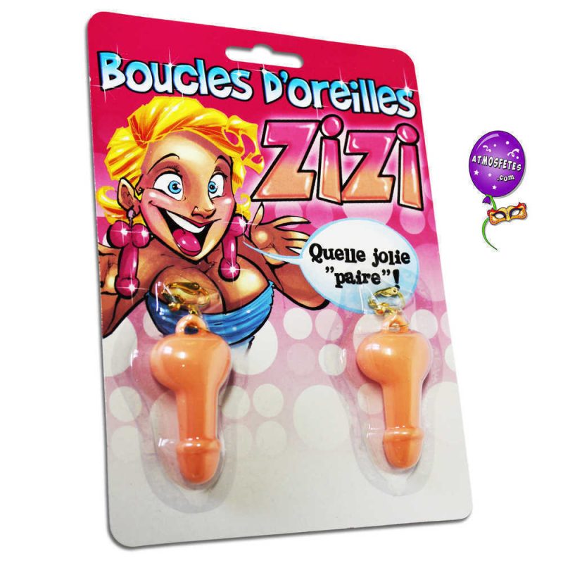 Paire de boucles d’oreilles en forme de zizis. Matière plastique, hauteur 5,5 cm hors attache métallique, présentées sous blister humoristique.