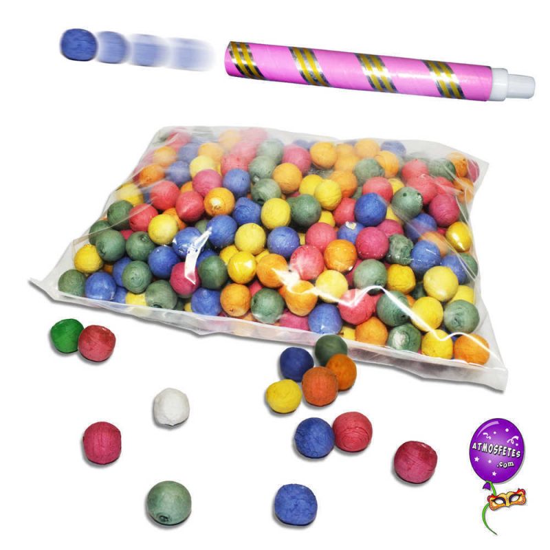boules multicolores papier mâché sarbacanes cotillons fête fiesta nouba mariage anniversaire tirer viser convives lancer projectiles amuser divertissement enfants munitions panière