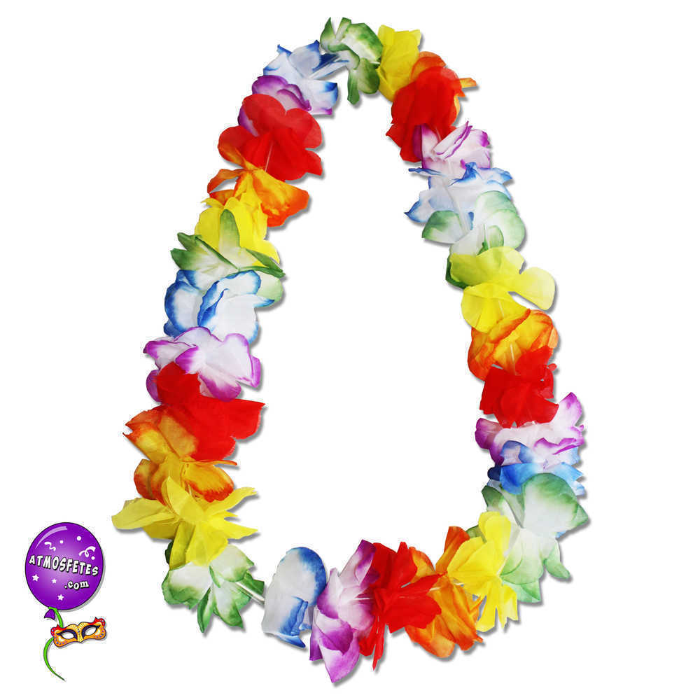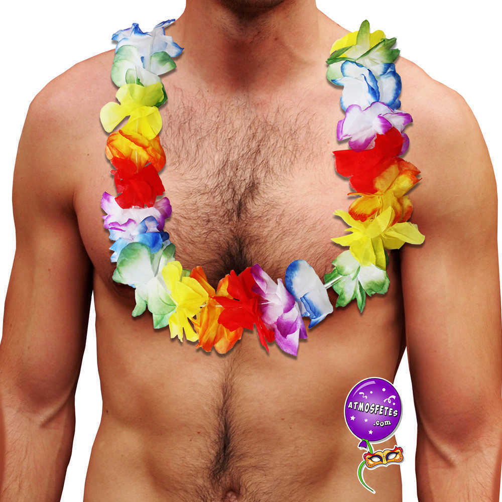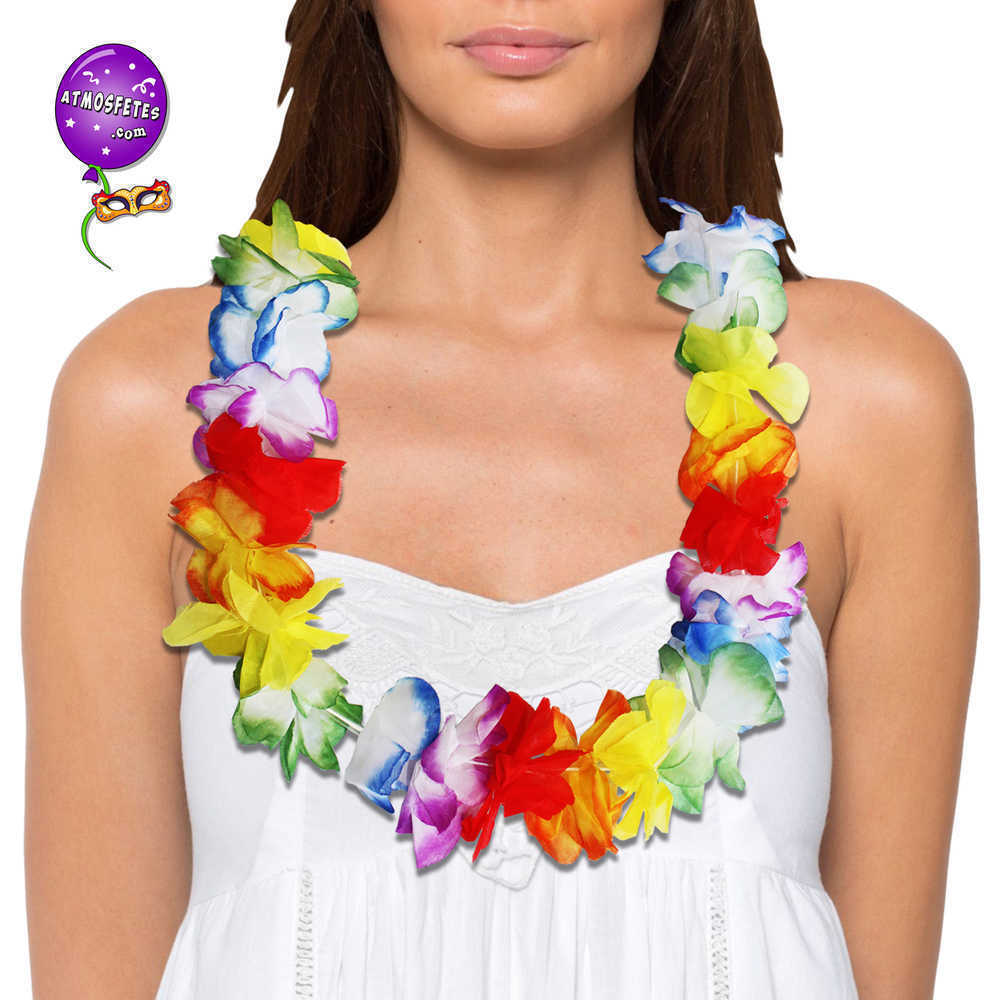 collier fleuri hawaïen multicolore pétales de fleurs artificielles fêter mariage accessoire de déguisement vacances île paradisiaque océan pacifique orchidées polynésie bermudes hawaii honolulu théâtre bronzette soleil palmiers cocotiers surf sable fin plage