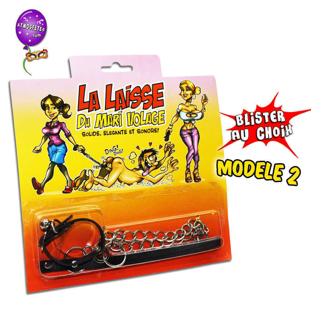 Laisse du mari volage. Chaînette et clochette métalliques, poignée et collier simili cuir, présentée sous blister humoristique décoré. Modèle blister au choix, prix unitaire. Longueur laisse : modèle 1 = 33 cm / modèle 2 = 53 cm.