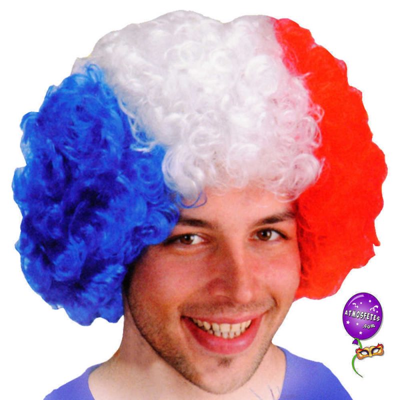 perruque pop big afro frisée bouclettes tricolore bleu blanc rouge allez la france supporters équipe match tous au stade tribunes football rugby rencontre sportive décoiffer cheveux chevelure