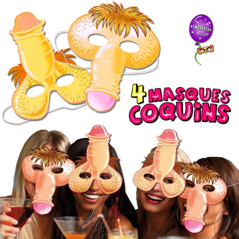 Ensemble de 4 masques coquins en carton fin, déclinés en deux modèles différents. Forme de sexe masculin avec trous pour les yeux et attache par liens élastiques. Taille individuelle 19 x 23 cm. Présentés sous sachet avec en-tête décorée humoristique.